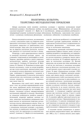 نویسندگان به تحلیل معنای مفهوم «فرهنگ سیاسی» و شیوه به کارگیری نظریه فرهنگ سیاسی در تحقیقات غرب و دانشمندان اوکراینی نویسندگان بر اساس مفاد مفهوم کلاسیک H. Almond و C. Verba و پیروان آنها، تفاوتهای تفسیر مفهوم فرهنگ سیاسی توسط محققان داخلی را بررسی کرده، رابطه آن را با پدیدههای سیاسی مرتبط – آگاهی سیاسی و سیاسی ترسیم میکنند. رفتار – اخلاق.