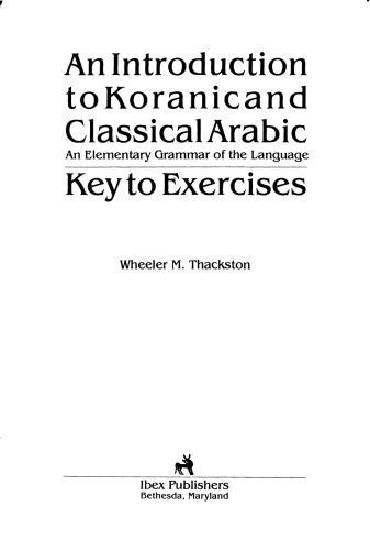 این کتاب کلید پاسخ ویلر ام. تاکستون، مقدمه ای بر قرآن و عربی کلاسیک است. تمرینهای ترجمه از عربی به انگلیسی با رومیسازی و ترجمه نمونه، تمرینهای از انگلیسی به عربی با ترجمههای نمونه به خط عربی ظاهر میشوند. متأسفانه هیچ توضیحی در مورد اینکه چرا ساختارها یا واژگان خاصی که هنوز آموزش داده نشده اند در پاسخ ها استفاده شده است.