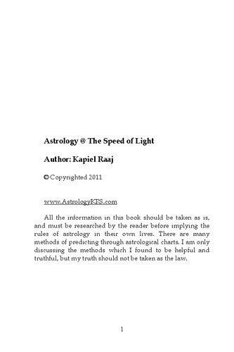 تمام اطلاعات این کتاب باید همانطور که هست گرفته شود، و قبل از اینکه خواننده قوانین طالع بینی را در زندگی خود به کار برد، باید مورد تحقیق قرار گیرد. روش های زیادی برای پیش بینی از طریق نمودارهای نجومی وجود دارد. من فقط درباره روش هایی بحث می کنم که به نظرم مفید و صادق هستند، اما حقیقت من نباید به عنوان قانون تلقی شود.