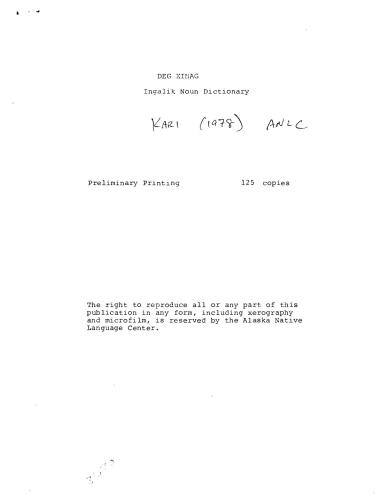 پیش نویس اولیه فرهنگ لغت Deg Xinag، چاپ محدود توسط ANLC. همچنین در مجموعه، ts. پیش نویس اول، تایپ شده از برگه های فایل. پوشش گسترده اما نه کامل اسم ها در گویش های یوکان و کوسکوکویم. انگلیسی به Ingalik، مرتب شده بر اساس دسته معنایی، حدود. 2500 مدخل، به تاریخ اکتبر 1976. همچنین، ts. با حاشیه نویسی جیم کاری.