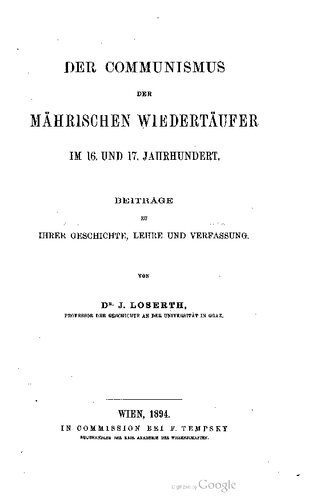 عنوان اصلی Der Communismus der Mährischen Brüder im 16. und 17. Jahrhundert. Beiträge zu ihrer Geschichte, Lehre und Verfassung