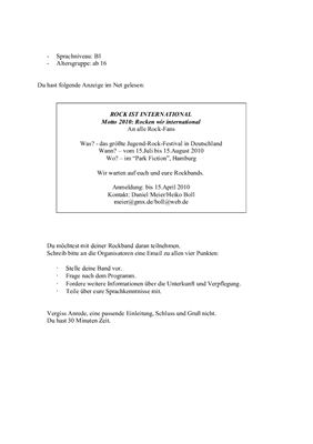 این یک کار بیانی معمولی است و زبان آموزان آلمانی را برای امتحان گواهینامه آلمانی (سطح B1) آماده می کند.