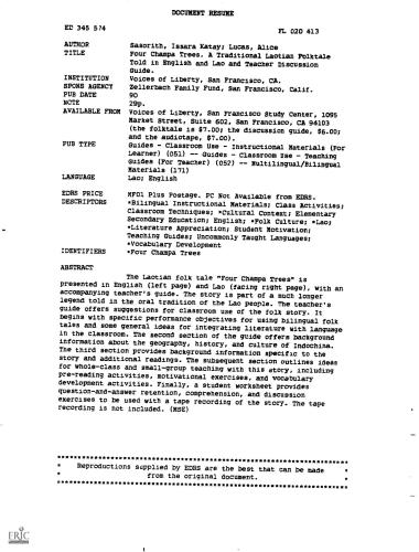 داستان عامیانه لائوس “FourChampa Trees” به زبان انگلیسی ارائه شده است (صفحه سمت چپ و لائوس (رو به صفحه سمت راست)، همراه با راهنمای معلم. داستان بخشی از یک افسانه بسیار طولانی است که در روایات شفاهی مردم لائوس بیان شده است. راهنمای معلم پیشنهادهایی را برای استفاده کلاس درس از داستان عامیانه ارائه می دهد. با اهداف عملکردی خاص برای استفاده از قصه های عامیانه دوزبانه و برخی ایده های کلی برای ادغام ادبیات با زبان در کلاس درس آغاز می شود. بخش دوم راهنما اطلاعات پس زمینه ای در مورد جغرافیا، تاریخ و فرهنگ هندوچین ارائه می دهد. بخش سوم اطلاعات پیش زمینه ای را برای داستان و خواندن های اضافی ارائه می دهد. و فعالیت های توسعه واژگان در نهایت، یک کاربرگ دانشآموز تمرینهایی را با پرسش و پاسخ، درک مطلب و بحث ارائه میکند تا با ضبط نوار داستان استفاده شود. ضبط مخروطی شامل نمیشود.