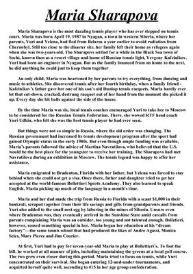 ماریا شاراپووا خیره کننده ترین تنیسوری است که تا به حال پا به زمین تنیس گذاشته است. ماریا در 19 آوریل 1987 در نیاگان، شهری در غرب سیبری به دنیا آمد، جایی که والدینش، یوری و یلنا، یک سال قبل از بلاروس فرار کرده بودند تا از تشعشعات چرنوبیل جلوگیری کنند. هنوز خیلی نزدیک به محل فاجعه بود، خانواده او وقتی دو ساله بود دوباره خانه خود را به عنوان پناهنده ترک کردند.