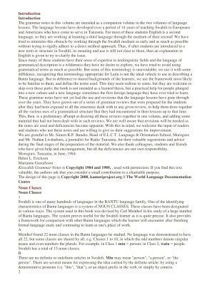 نکات دستور زبان در این جلد به عنوان جلد همراه دو جلد درس زبان در نظر گرفته شده است. دروس زبان در طول 14 سال آموزش سواحیلی به اروپایی ها و آمریکایی هایی که برای خدمت به تانزانیا آمده اند، توسعه یافته است. برای اکثر این دانش آموزان، انگلیسی زبان دوم است، بنابراین آنها در حال یادگیری زبان سوم از طریق زبان دوم خود هستند! ما سعی کردهایم این مانع را با کار کردن از طریق رسانه سواحیلی در اسرع وقت و تا آنجا که ممکن است، بدون تلاش برای پایبندی دقیق به یک روش مستقیم، به حداقل برسانیم. بنابراین، اگر پس از آشنا شدن دانش آموزان با یک اصطلاح یا ساختار جدید در زبان سواحیلی، هنوز معنی و کاربرد آن برای آنها روشن نیست، در این صورت توضیحی به زبان انگلیسی برای روشن شدن موضوع ارائه می شود.