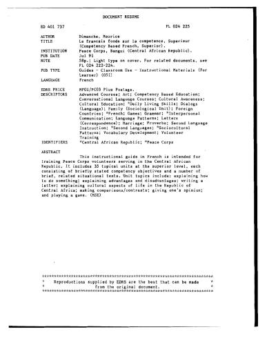 این راهنمای آموزشی به زبان فرانسوی برای آموزش داوطلبان سپاه صلح که در جمهوری آفریقای مرکزی خدمت می کنند در نظر گرفته شده است. این شامل 35 واحد موضوعی در سطح برتر است که هر یک از اهداف شایستگی به طور خلاصه و تعدادی متن موقعیتی مختصر و مرتبط تشکیل شده است. موضوعات واحد عبارتند از: توضیح نحوه انجام کاری. توضیح مزایا و معایب؛ نوشتن نامه؛ تبیین جنبه های فرهنگی زندگی در جمهوری آفریقای مرکزی؛ انجام مقایسه/تضاد؛ اظهار نظر؛ و انجام یک بازی