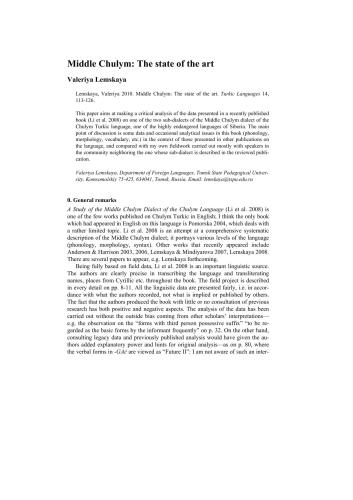 این مقاله با هدف تحلیل انتقادی داده های ارائه شده در کتاب اخیراً منتشر شده (Li et al. 2008) در مورد یکی از دو گویش فرعی گویش چولیمی میانی زبان ترکی چولیم، یکی از زبانهای بسیار در معرض خطر سیبری. موضوع اصلی بحث، برخی داده ها و مسائل تحلیلی گاه به گاه در این کتاب (آواشناسی، صرف شناسی، واژگان و غیره) در چارچوب مواردی است که در سایر نشریات در مورد زبان ارائه شده است و در مقایسه با کار میدانی خودم که بیشتر با سخنرانان در جامعه همسایه با گویش فرعی که در نشریه بررسی شده شرح داده شده است.