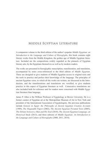 این کتاب که همراه با ویرایش سوم کتاب محبوب مصری میانه نویسنده است، شامل هشت اثر ادبی از پادشاهی میانه، عصر طلایی ادبیات مصر میانه است. شامل آثاری است که به طور گسترده به عنوان اوج هنرهای ادبی مصر، توسط خود مصری ها و همچنین توسط خوانندگان مدرن شناخته می شود. آثار با رونویسی هیروگلیف، آوانویسی و ترجمه همراه با یادداشت هایی با ارجاع متقابل به چاپ سوم مصری میانه ارائه شده است. اینها طراحی شده اند تا دانش آموزان مصر میانه به متون اصلی و ابزارهایی برای تمرین و تکمیل دانش خود در مورد زبان دسترسی داشته باشند. اصول شعر مصر باستان، که در آن همه آثار نوشته شده است، مورد بحث قرار می گیرد، و ترجمه ها و ترجمه ها تأیید می شود و به دانش آموزان امکان تمرین در این جنبه از ادبیات مصر را نیز می دهد. ترجمه های متوالی نیز برای مرجع و برای خوانندگانی که بیشتر به ادبیات مصر میانه توجه دارند تا زبان گنجانده شده است.
