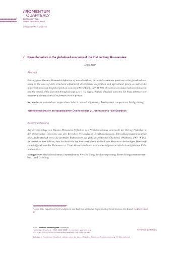 با شروع از تعریف Kwame Nkrumah از نئوکلونیالیسم ، این مقاله به بررسی شیوه های اقتصاد جهانی شده در زمینه بدهی ، تعدیل ساختاری ، همکاری توسعه و سیاست های کشاورزی و همچنین نهادهای اصلی اقتصاد سیاسی جهانی (بانک جهانی ، صندوق بین المللی پول ، WTO) می پردازد. بشر مقاله نتیجه می گیرد که نئوکلونیالیسم و کنترل اقتصاد از طریق بازیگران خارجی یک ویژگی منظم اقتصاد امروز است. با این حال ، این بازیگران لزوماً همیشه با قدرتهای استعماری سابق یکسان نیستند.