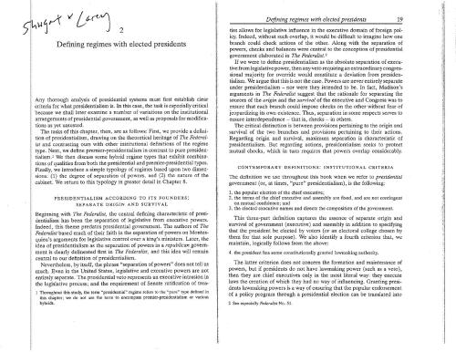 در سال های اخیر توجه مجدد به اهمیت نقش طراحی سازمانی معطوف شده است. در سیاست دموکراتیک توجه ویژه به طراحی قانون اساسی و شایستگی های نسبی نظام پارلمانی در مقابل نظام ریاستی مربوط می شود. اجماع مجازی حول این بحث شکل گرفته است که نظام های پارلمانی به طور کلی بر نظام های ریاستی ارجحیت دارند، که عمدتاً به دلیل از دست دادن قدرت به قوه مجریه و مجلس در نظام های ریاستی است. در این کتاب، نویسندگان به طور سیستماتیک نقاط قوت و ضعف اشکال مختلف نظام های ریاست جمهوری را با تکیه بر تحولات اخیر در ادبیات نظری در مورد طراحی نهادی و قوانین انتخاباتی ارزیابی می کنند. آنها یک گونه شناسی از رژیم های دموکراتیک را توسعه می دهند که بر اساس اصل تفکیک قوا، شامل دو شکل ترکیبی، نظام نخست رئیس جمهور و رئیس جمهور-پارلمان، ساخته شده است، و تعدادی از راه های جایگزین برای موازنه قوا بین شاخه ها را در این چارچوب های اساسی ارزیابی می کنند. . آنها همچنین نشان میدهند که قوانین انتخاباتی در تعیین چگونگی اعمال اقتدار در این سیستمها بسیار مهم هستند، و طیفی از قوانین انتخاباتی را که میتوان تنظیم کرد و تأثیراتی که بر شکل نظامهای حزبی، برنامههای سیاسی و بر روی نظامهای حزبی میگذارند، بسیار مهم است. چشم انداز همکاری بین روسای جمهور و مجالس.