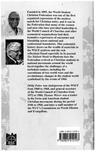 فدراسیون جهانی مسیحی دانشجویی که در سال 1895 تأسیس شد، یکی از اولین عبارات سازمان یافته جستجوی مدرن برای وحدت مسیحی بود. و در فدراسیون بود که بسیاری از زنان و مردانی که بعدها رهبری شورای جهانی کلیساها و دیگر سازمان‌های جهانی را بر عهده گرفتند، تجربیات شکل‌دهنده‌ای از برخورد و دوستی در فراسوی مرزهای ملی و اعترافی داشتند. این تاریخ صد ساله برگرفته از انبوه مطالب موجود در آرشیو WSCF و بازتاب های غنی است که به ویژه در مجله آن The Student World یافت می شود تا نشان دهد که چگونه فدراسیون به عنوان دانشجویان مسیحی در جنبش های ملی در سراسر جهان با چالش های یک قرن متلاطم روبرو شدند. تشنج دو جنگ جهانی و تغییرات انقلابی در دنیای دانشجویی که نماد آن رویدادهای سال 1968 است.