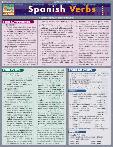 مبانی افعال اسپانیایی در قالب به راحتی قابل دسترس ما. این راهنمای چند صفحهای شامل: اجزای فعل، انواع افعال، افعال منظم، افعال بازتابی، صدای مفعول، حالت امری، افعال نامنظم، افعال مفید (منظم و نامنظم) است.