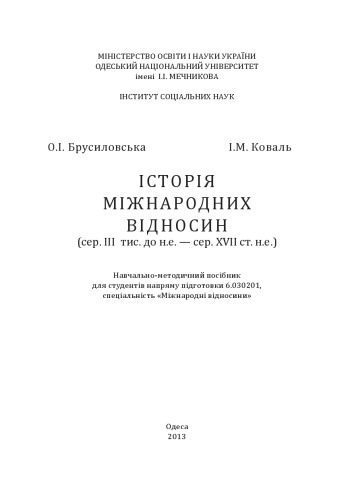 | عنوان اصلی | Історія міжнародних відносин (сер. III тис. до н.е. — сер. XVII ст. н.е.) : навчально-методичний посібник для студентів ОНУ ім. І.І. Мечникова |