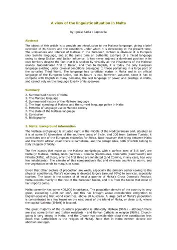 هدف این مقاله ارائه مقدمه ای بر زبان مالتی، ارائه مروری کوتاه بر تاریخچه و شرایط آن است. که در حال حاضر در حال توسعه است. منحصر به فرد بودن و علاقه مالتی به بافت اروپایی آشکار است: این زبان تنها زبان سامی اروپا است و در عین حال نمونه ای معتبر از زبان ترکیبی به دلیل نفوذ عمیق سیسیلی و ایتالیایی است. علیرغم این واقعیت که تقریباً همه ساکنان جزایر مالت به آن صحبت می کنند، هرگز از موقعیت غالب در قلمرو خود برخوردار نبوده است. این زبان که ابتدا تابع ایتالیایی و سپس انگلیسی است، امروزه تنها زبان اروپایی است که در شرایط استعماری مشابه زبان‌هایی است که در بخش بزرگی از به اصطلاح جهان سوم وجود دارد. این زبان در مالتا دارای وضعیت رسمی مشترک است و زبان رسمی اتحادیه اروپا است، اما آینده آن مطمئن نیست، زیرا باید در بسیاری از حوزه ها با انگلیسی رقابت کند، زبان واقعی قدرت و اعتبار در مالت، و نمی تواند به وفاداری زبان گویشوران خود تکیه کند.