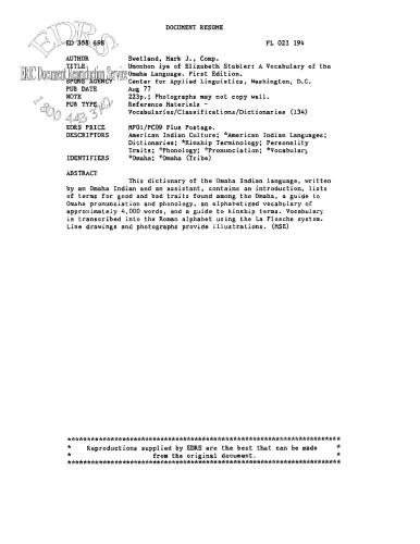 این فرهنگ لغت زبان هندی اوماها، نوشته یک سرخپوست اوماها و یک دستیار، شامل مقدمه، فهرستی از اصطلاحات برای صفات خوب و بد موجود در میان اوماها، راهنمای تلفظ و واج شناسی اوماها، واژگان حروف الفبا از تقریباً 4000 کلمه، و راهنمای اصطلاحات خویشاوندی است. واژگان با استفاده از سیستم La Flesche به الفبای رومی رونویسی می شود. نقاشی های خطی و عکس ها تصاویر را ارائه می دهند.
