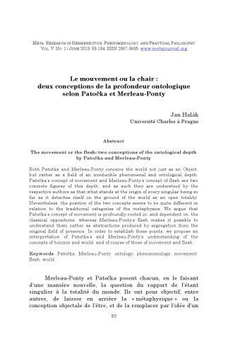 هم پاتوکا و هم مرلوپونتی جهان را نه تنها بهعنوان یک شی، بلکه بهعنوان میدانی از عمق هستیشناختی پدیداری و تقلیلناپذیر تصور میکنند. مفهوم حرکت در پاتوکا و مفهوم گوشت در مرلوپونتی دو چهره عینی از این عمق هستند و تا این حد توسط دو نویسنده به ترتیب به عنوان آنچه در منشأ هر موجود منفرد است تا آنجا که در برابر آن متمایز است درک می کنند. پس زمینه جهان به عنوان یک کلیت باز. با این حال، به نظر می رسد جایگاه این دو مفهوم در رابطه با مقوله های سنتی متافیزیک کاملاً متفاوت باشد. نویسنده این تز را توسعه می دهد که بر اساس آن مفهوم پاتوکی از جنبش عمیقاً در تقابل های کلاسیک ریشه دارد و بنابراین به طور اساسی به آنها وابسته است، در حالی که مفهوم مرلوپونتین از گوشت درک این تقابل ها را به عنوان انتزاعیات حاصل از جداسازی ممکن می سازد. از میدان اصلی حضور. نویسنده برای تثبیت این نکات، تفسیری از درک مربوط به دو فیلسوف از مفاهیم افق، جهان، حرکت و گوشت ارائه میکند.