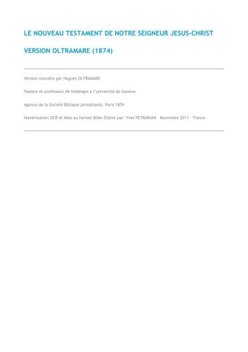 Hugues Oltramare (1813-1891) کشیش ژنو و استاد تفسیر در دانشکده الهیات او نویسنده چیزی است که می توان آخرین ترجمه ادبی و اولین نسخه علمی عهد جدید (1872) نامید.