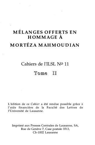 | عنوان اصلی | Cahiers de l’ ILSL n° 11 : Mélanges offerts en hommage à Mortéza Mahmoudian. Tome II |