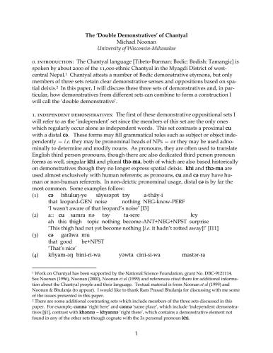 زبان چانتیال [تیبتی-برمنی: Bodic: Bodish: Tamangic] توسط حدود 2000 نفر از 11000 قومی چانتیال صحبت می شود. در ناحیه میاگدی در غرب مرکزی نپال. 1 شانتیال تعدادی از استیمونهای نمایشی بودیک را تأیید میکند، اما تنها اعضای سه مجموعه حواس و مخالفتهای واضح بر اساس دئیکسی فضایی را حفظ میکنند. بهویژه، اینکه چگونه نمایشدهندههای مجموعههای مختلف میتوانند ترکیب شوند تا ساختاری را تشکیل دهند، من آن را «نمایش مضاعف» مینامم.