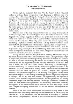 “در نگاه اول کوتاه مدرنیست داستان قصر یخی اثر F.S. Fitzgerald یک درام معمولی را بین دو فرد متعلق به بخشهای مختلف یک کشور ارائه میکند که روابطشان نمیتواند شکاف عمیق بین آنها، دیدگاههایشان، سبک زندگی جوامعی که به آن تعلق دارند را پر کند. چنین داستانهایی در همه جا وجود دارند. اما قصر یخی یک تراژدی عشقی محض نیست.اف.اس.فیتزجرالد به توصیف تکان دهنده پیوندهای انسانی به عنوان ابزاری برای ترسیم پرتره دو ذهنیت متفاوت متوسل می شود.بنابراین، انشعاب کوچک بین یک دختر جنوبی و یک پسر. از شمال به نظر میرسد کپی شکاف بزرگی بین نه تنها سرزمینهای متفاوت جغرافیایی، بلکه، و در درجه اول، بین ذهنیتها و ارزشهای انسانی است.» . .