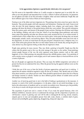 به نظر می رسد زندگی ما بدون هنر غیر ممکن است. واقعاً بخش مهمی در زندگی روزمره ما را اشغال می کند. هنر نه تنها به ما لذت و سرگرمی می دهد، بلکه وسیله ای برای فرهنگ و آموزش است. هنر در تمام عرصه ها و جنبه های زندگی ما نفوذ می کند و آن را روشن تر، غنی تر و روشنفکرتر می کند. مردم انواع مختلف هنر را دوست دارند و می شناسند. برخی از آنها به نقاشی علاقه دارند.