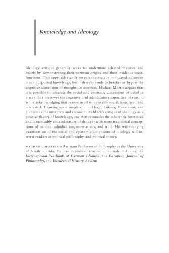 نقد ایدئولوژی عموماً به دنبال تضعیف نظریه ها و باورهای منتخب با نشان دادن خاستگاه حزبی و کارکردهای اجتماعی موذیانه آنهاست. این رویکرد به درستی ماهیت اجتماعی بسیاری از دانش ادعایی را آشکار میکند، اما ویژگیهای شناختی آن را نیز در براکت یا دور میزند. در مقابل، مایکل موریس استدلال می کند که امکان ادغام ابعاد اجتماعی و معرفتی باور به گونه ای وجود دارد که ظرفیت های شناختی و قضاوتی عقل را حفظ کند، در حالی که اذعان می کند که عقل خود ناگزیر اجتماعی، تاریخی و علاقه مند است. او با تکیه بر بینشهای هگل، لوکاچ، مانهایم و هابرماس، نقد مارکس از ایدئولوژی را بهعنوان نظریهای مثبت از معرفت تفسیر و بازسازی میکند، نظریهای که ماهیت ذاتاً علاقهمند و مکان جداییناپذیر اندیشه را با مفاهیم سنتیتر داوری عقلانی، هنجاری، آشتی میدهد. و حقیقت بررسی گسترده او از ابعاد اجتماعی و معرفتی ایدئولوژی خوانندگان را به فلسفه سیاسی و نظریه سیاسی علاقه مند خواهد کرد.