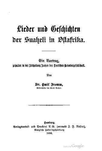 آهنگ ها و داستان های سوهلی در آفریقای شرقی. سخنرانی ، که در بخش آخن جامعه استعمار آلمان برگزار شد |