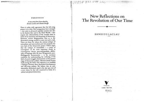 تأملات جدید در مورد انقلاب زمان ما به کاوش نوآورانه در مورد مسائل عمده مربوط به دموکراسی و سوسیالیسم ادامه می دهد که در هژمونی و استراتژی سوسیالیستی مطرح شد. لاکلائو با بررسی معانی مبارزه اجتماعی در چارچوب سرمایه داری متاخر، بازسازی هویت های سیاسی را در چارچوب انقلاب دموکراتیک قرار می دهد. روش انتقادی روشی است که همزمان با نظریه‌پردازی شکل تفسیری منسجم و ریشه‌ای، تغییرات ساختاری عمده را در نظام جهانی معاصر توصیف می‌کند. این تلاقی سیاست و نظریه به کتاب اجازه می دهد تا موضوعاتی از رابطه مارکسیسم و ​​روانکاوی تا اهمیت تاریخی می 1968 و اشکال مبارزه سیاسی در جهان سوم را در بر بگیرد. نویسنده در آخرین بخش از مصاحبه‌های روشنگر، جدیدترین اندیشه خود را درباره سیاست و فلسفه بیان می‌کند.