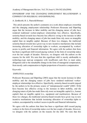 این مقاله نظرات نویسنده را در مورد اثری در مورد مالکیت کارکنان و تغییر رابطه شغلی ارائه می دهد. پروفسور روسو و شپرلینگ استدلال میکنند که افزایش تحرک نیروی کار و تغییر ماهیت مشاغل، روابط سنتی کارگر و کارفرما را کمتر مؤثر کرده است. به طور خاص، پاداشهای مبتنی بر ارشدیت به دلیل افزایش تحرک نیروی کار کمتر مؤثر شدهاند و ماهیت متغیر مشاغل باعث شده است که شرکتها بیشتر به سرمایه نامشهود متکی باشند تا سرمایه ملموس. به دلیل این دو تغییر، پاداشهای سنتی مبتنی بر ارشدیت جای خود را به مکانیسمهای تشویقی جدیدی داده است که شامل افزایش تخصیص حقوق مالکیت به کارگران، همراه با دسترسی کارگران به سود و اطلاعات مالی است. (25000 نشانه)