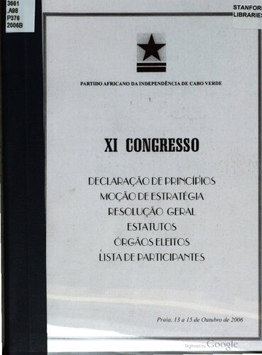 عنوان اصلی Partido Africano da Independência de Cabo Verde. XI Congresso. Declaração de princípios. Moção de estratégia. Resolução geral. Estatutos. Órgãos eleitos. Lista de participantes. Praia, 13 a 15 de Outubro de 2006