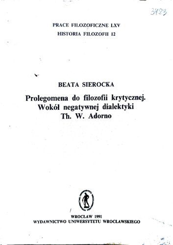 | عنوان اصلی | Prolegomena do filozofii krytycznej. Wokół negatywnej dialektyki Th. W. Adorno |