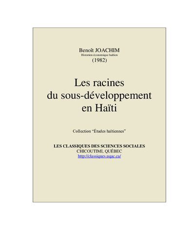 نسخه الکترونیکی بر اساس کتاب Benoît Joachim، ریشه های توسعه نیافتگی در هائیتی. Port-au-Prince, Haiti: Imprimerie H. Deschamps, 1979, 257 pp. نسخه دیجیتالی که به طور مشترک با کمک پیر پاتنود، داوطلب، معلم و نویسنده بازنشسته، Chambord، Lac-Saint-Jean، کبک تولید شده است.