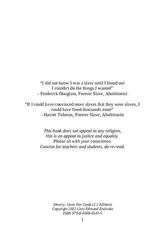 از پشت کتاب: برده داری هنوز وجود دارد و لغو کنندگان گذشته به قول خودشان ثابت کنند آنها تکذیب شدند و به هر شکل ممکن مورد حمله قرار گرفتند. انگیزه های آنها برای پایان دادن به برده داری chattel به بردگی chattel ختم نشد. هنوز جامعه باید بفهمد که برده داری در واقع چه تعریفی است. به عنوان رویه ای که هزاران سال وجود دارد، نمی توان انتظار داشت که به سادگی از روی زمین محو شود، به خصوص اگر مردم جهان قادر به تعریف چنین مفاهیم و انگیزه های حیاتی نباشند. اگر در دنیایی از هرج و مرج، فریب، ترس، جهل، کنترل یا سردرگمی زندگی میکنید، اکنون وقت آن است که خود را در مورد این مفاهیم و اقدامات مربوط به آنها روشن کنید، اگر نمیخواهیم تاریخ را تکرار کنیم، و در عوض، تکامل بشریت را در جهان ادامه دهیم. پایان دادن به برده داری، یک بار برای همیشه، در همه اشکال آن، برای تمام بشریت و برای همیشه.