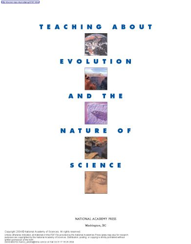 Teaching About Evolution and Nature of Science چارچوبی با ساختار مناسب برای درک و آموزش تکامل فراهم می کند. این کتاب که برای معلمان، والدین، و مقامات جامعه و همچنین برای دانشمندان و مربیان نوشته شده است، نشان می دهد که چگونه تکامل تنوع زیاد و شباهت اساسی موجودات زمین را توضیح می دهد. بررسی می کند که چگونه دانشمندان به مسئله تکامل برخورد می کنند. و ماهیت علم را به عنوان راهی برای شناخت جهان طبیعی توصیف می کند. علاوه بر این، این کتاب پاسخ هایی به سوالات متداول ارائه می دهد تا به خوانندگان کمک کند تا بسیاری از مسائل و تصورات نادرست در مورد تکامل را درک کنند.