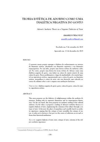 عنوان اصلی Teoria Estética de Adorno como uma Dialética Negativa do Gosto