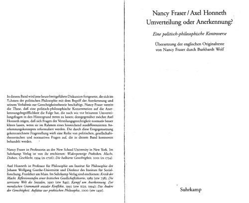 این جلد بحث گسترده ای را ادامه می دهد که به مفهوم شناخت و رابطه آن با نظریه عدالت در چارچوب فلسفه سیاسی می پردازد. نانسی فریزر از این تز دفاع می کند که تمرکز سیاسی-فلسفی بر مفهوم شناخت منجر به فروکش کردن پرسش های هنوز انفجاری بازتوزیع به پس زمینه می شود. از سوی دیگر، اکسل هونت مایل است نشان دهد که مسائل عدالت توزیعی اگر در چارچوب مفهومی به اندازه کافی متمایز از شناخت مجدداً فرموله شوند، می توانند به صورت هنجاری بهتر روشن شوند. پرسشگری که این اپوزیسیون مشخص می کند تعدادی پرسش سیاسی، اجتماعی-نظری و هنجاری را مطرح می کند که در این مجلد به طور بحث انگیزی به آنها پرداخته شده است.