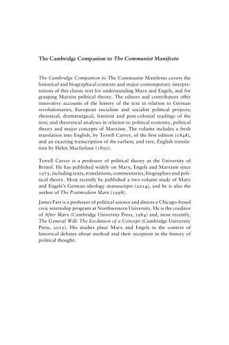 همراه کمبریج برای مانیفست کمونیست، زمینه های تاریخی و بیوگرافی و تفاسیر عمده معاصر این متن کلاسیک را برای درک مارکس و انگلس، و برای درک نظریه سیاسی مارکسیستی پوشش می دهد. ویراستاران و همکاران گزارش های بدیع از تاریخ متن در رابطه با انقلابیون آلمان، سوسیالیسم اروپایی، و پروژه های سیاسی سوسیالیستی ارائه می دهند. خوانش بلاغی، دراماتورژیک، فمینیستی و پسااستعماری متن؛ و تحلیل های نظری در رابطه با اقتصاد سیاسی، نظریه سیاسی و مفاهیم عمده مارکسیسم. این جلد شامل یک ترجمه جدید به انگلیسی، توسط ترل کارور، از اولین نسخه (1848) و یک رونویسی دقیق از نادرترین ترجمه انگلیسی (1850) توسط هلن مک فارلین است.