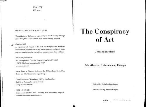 تصاویر ابوغریب برای آمریکا به اندازه تصاویر مرکز تجارت جهانی در آتش است. تمام غرب در انفجار خنده های سادیستی سربازان آمریکایی است، زیرا پشت ساخت دیوار اسرائیل است. اینجاست که حقیقت این تصاویر نهفته است. حقیقت، اما نه حقیقت. همانقدر که خود جنگ مجازی است، خشونت خاص آنها به خشونت خاص جنگ می افزاید. بودریار در توطئه هنر، امتیازی را که دست اندرکاران هنر به هنر می دهند زیر سوال می برد. هنر تمام اشتیاق به توهم را از دست داده است: با بازخورد بی پایان به خود، ناپدید شدن خود را به هنری برای خود تبدیل کرده است. بودریار به دور از ابراز تاسف از «پایان هنر»، کارکرد جدید هنر را در فرآیند تجارت داخلی تجلیل میکند. هنر که از پوچی زیباییشناختی به جنون تجاری میپیچد، مانند کل جامعه به فرازیباییشناختی تبدیل شده است. توطئه هنر نوشتههای بودریار در مورد هنر را در رقصی همدستانه اقتصادی با سیاست ارائه میکند. و رسانه ها این کتاب که با «پورن جنگی»، تحلیلی کوبنده از تصاویر دیدنی زندان ابوغریب بهعنوان ژانر جدیدی از تلویزیونهای واقعیت به اوج میرسد، به خود بازمیگردد تا ماهیت تفکر رادیکال را زیر سوال ببرد.