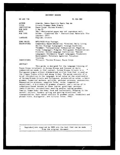 این راهنما برای آموزش زبان داوطلبان سپاه صلح در گینه بیسائو طراحی شده است و بر نیازهای ارتباطی روزانه تمرکز دارد. در آن زمینه گینه بیسائو کریولو یک پیجین * پرتغالی بدون فرم نوشتاری استاندارد است که به عنوان زبان فرانکا در داخل و بین قبایل استفاده می شود. این راهنما شامل مقدمه ای کوتاه بر زبان، یادداشت های مختصری در مورد رابطه گینه بیسائو کریولو و پرتغالی، یادداشت های تلفظ، دستور زبان پایه (نشانگرهای عددی، مقالات، ضمایر شخصی، ملکی، ضمایر اثباتی، اشکال منفی، افعال، مقایسه ای است. صفت ها)، فرهنگ لغت عناصر دستور زبان، و مجموعه ای از 14 درس مبتنی بر شایستگی در مورد این موضوعات: greetings; شناسایی شخصی؛ مقدمه ها؛ ملاقات با مردم؛ خداحافظی؛ خانواده؛ بدن انسان؛ خانه؛ غذا و رستوران؛ خرید در بازار؛ خیاطی، لباسشویی؛ دادن و گرفتن جهت؛ و حمل و نقل هر درس شامل نکات دستور زبان، واژگان و فهرست عبارات، گفتگو(ها) و یادداشت های فرهنگی است.