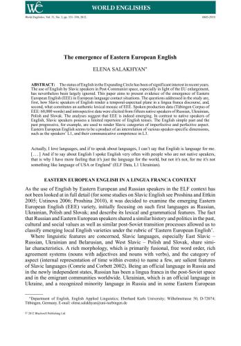 وضعیت زبان انگلیسی در دایره گسترش یافته در سالهای اخیر مورد توجه قابل توجهی قرار گرفته است. استفاده از زبان انگلیسی توسط اسلاو زبانان در فضای پساکمونیستی، به ویژه با توجه به گسترش اتحادیه اروپا، با این وجود تا حد زیادی نادیده گرفته شده است. هدف این مقاله ارائه شواهدی از ظهور انگلیسی اروپای شرقی (EEE) در موقعیتهای تماس با زبان اروپایی است. سؤالاتی که در این مطالعه به آنها پرداخته میشود، اولاً، این است که چگونه اسلاویزبان انگلیسی یک صفحه زمانی-جنبهای را در یک گفتمان زبانی ارائه میکنند، و دوم، اینکه چه چیزی موزاییک واژگانی معتبر EEE را تشکیل میدهد. دادههای تولید گفتاری (Tu bingen Corpus of EEE: 60000 کلمه) و دادههای دروننگر از پانزده زبان مادری روسی، اوکراینی، لهستانی و اسلواکی استخراج شد. تجزیه و تحلیل ها نشان می دهد که EEE واقعاً در حال ظهور است. بر خلاف زبان مادری انگلیسی، اسلاوی زبانان دارای مجموعه محدودی از زمان های انگلیسی هستند. برای مثال، گذشته ساده انگلیسی و گذشته مترقی برای ارائه مقولههای اسلاوی از جنبه ناقص و کمال استفاده میشوند. به نظر می رسد انگلیسی اروپای شرقی محصول رابطه متقابل ابعاد مختلف سخنران خاص، مانند L1 سخنرانان، و صلاحیت ارتباطی آنها در L3 باشد.