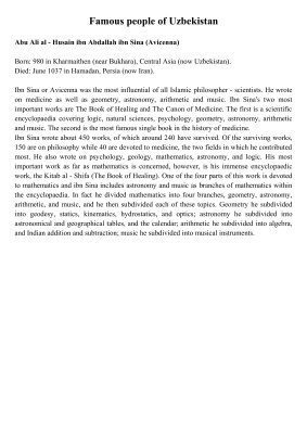 شرح زندگی و آثار مشاهیر ازبکستان به زبان انگلیسی: ابن سینا، برونی، امیر تیمور، سلسله تیموری، بابور ، خوارزمی. متون ارائه شده را می توان به عنوان موضوعات شفاهی و به عنوان مبنایی برای مقاله یا ارائه استفاده کرد.