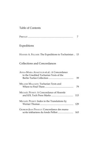 هدف گلچین حاضر کمک به چنین اثری است. اولین مقاله در این گلچین توسط Hannes A. Fellner مروری بر سفرهای مختلف به حوضه تاریم در آغاز قرن بیستم ارائه می‌کند. دانستن اینکه این دست نوشته ها از کجا آمده اند و در چه شرایطی پیدا شده اند، نه تنها یک موضوع جالب تاریخی است، بلکه به دو دلیل حیاتی است. برای یک چیز، به درک چگونگی گردآوری مجموعه‌های مختلف کمک می‌کند – و هیچ مجموعه‌ای از متون توچاری وجود ندارد که سرنوشت پیچیده‌ای نداشته باشد. برای دیگری، از نظر زبانی مهم است که مکان مربوطه را که یک نسخه خطی از آن آمده است، قرار دهیم، زیرا بقایای زبانی توچاریان B باید به انواع مختلف تقسیم شوند، واقعیتی که توسط ورنر وینتر در سال 1955 کشف شد. به همین دلیل، مسئله تخصیص نسخه های خطی مطرح شد. به ترکستان یافتن لکه ها موضوعی است در مقالات مربوط به مجموعه ها و همخوانی ها. در پایان مقاله خود “متون توچاری و کجا می توان آنها را پیدا کرد”، فهرستی از تمام نقاط یافت شده شناخته شده متون توچاری را به همراه نقشه ارائه می کنم. این مقاله مروری بر مجموعه‌ها و نسخه‌های متنی و همچنین فهرستی از اختصارات و sigla در حال استفاده را ارائه می‌دهد. بزرگ ترین و مهم ترین مجموعه نسخ خطی توچاریان در برلین، لندن و پاریس نگهداری می شود. متأسفانه، مجموعه متون توچاری از لندن و پاریس برای مدت طولانی برای افراد غیرمتخصص ناشناس بوده است. بنابراین بسیار مهم است که ژرژ ژان پینو مطالعه مفصلی در مورد متون مجموعه پاریس برای این گلچین ارائه کرده است (“Concordance des manuscrits tokhariens du fonds Pelliot”). از این کار بنیادی نه تنها مشخص خواهد شد که مجموعه شامل چه تعداد و چه نوع متون توچاری است و کدام یک از آنها قبلاً منتشر شده است، بلکه چقدر کار هنوز باید انجام شود. مایکل پیرو تطابق نسخه J. W. Broomhead از متون لندن را با امضاهای فعلی ارائه کرده است که نه تنها استفاده از نسخه برومهد را تسهیل می کند، بلکه کاربر را قادر می سازد عکس های دست نوشته های مربوطه را پیدا کند. در مورد مجموعه برلین، گروهی از شاگردانم وظیفه گردآوری «همخوانی با متون توچاری ویرایش نشده مجموعه تورفان برلین» را بر عهده گرفته اند. همانطور که از نکات مقدماتی این مقاله مشخص خواهد شد، تا هفت نوع امضای مختلف وجود دارد که متون توچاری از مجموعه برلین را می توان به وسیله آنها نقل کرد و در واقع نقل کرد، بنابراین خواننده ممکن است این را ابزار مفیدی بیابد.