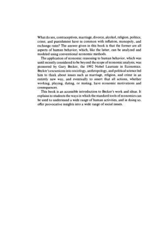 این جلد به مسائل مهم اجتماعی و سیاسی از چشم اقتصاددانان می نگرد. این رویکرد که توسط گری بکر ابداع شد، ادعا میکند که همه اعمال، اعم از کار کردن، بازی کردن، قرار ملاقات یا جفتگیری، انگیزهها و پیامدهای اقتصادی دارند و میتوانند با استفاده از استدلال اقتصادی تحلیل شوند. مقالاتی که به عنوان مقدمه ای بر وضعیت فعلی این رشته در نظر گرفته شده اند، غیررسمی و غیر فنی هستند، در حالی که هنوز از استدلال اقتصادی به روز برای روشن کردن موضوعاتی مانند جرم، ازدواج، تبعیض، مهاجرت، مدها و مدها استفاده می کنند.