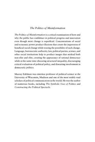 سیاست اطلاعات نادرست، بررسی این است که چگونه تمرکز قدرت اجتماعی و اقتصادی به زبانهای عمومی سیاست منجر میشود که در انکار گرایشهای غیردموکراتیک لزوماً مبتنی بر تصویر، مبهم و گمراهکننده هستند. در نتیجه، گفتمانهای عمومی دموکراسی تمایل به پوپولیستی، احساسی و احتمالاً تأکید بر تصاویر پیشرفت به جای نابرابریهای ساختاری در فرمولبندی مشکلات عمومی دارند. به طور خلاصه، نه تعاریف معمولی مشکل و نه راهحلها به درک انتقادی عمومی یا مشارکت در سیاستهای دموکراتیک نیاز ندارند.