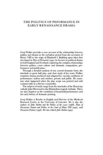 گرگ واکر گزارش جدیدی از رابطه بین سیاست و درام در دوره پرتلاطم از سلطنت هنری هشتم تا سلطنت الیزابت اول ارائه می دهد. او با تکیه بر ایده هایی که برای اولین بار در نمایشنامه های متقاعدسازی (1991) توسعه یافته بود، بر درام سیاسی در هر دو تمرکز می کند. انگلستان و اسکاتلند، کاوش در روابط پیچیده میان سیاست، فرهنگ دادگاه و ترکیب نمایشی، اجرا و انتشار. این تحلیل میان رشته ای بازاری را در میان مورخان تودور و همچنین دانشجویان نمایشنامه قرون وسطایی و رنسانس پیدا می کند.