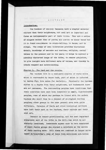 سانداوهای مرکزی تانزانیا فرهنگ مادی ساده تری نسبت به همسایگان خود دارند، اما هنر شفاهی مهم است و بخشی ضروری از زندگی آنها را تشکیل می دهد. آنها ملتی خوانندگان هستند تا شاعران. همه شعرها بیت فرعی هستند اما در همه جا یافت می شود: در داستان گویی، در رقص، و در آیین. مطالعه ادبیات شفاهی جزئیات تاریخی، آگاهی از آداب و رسوم، دین، ارزش های اجتماعی در زمان حال و گذشته را ارائه می دهد. این امر به تصحیح یک تصویر احتمالاً تحریف شده از قبیله کمک می کند، تعصب را از بین می برد، به مجموعه های مختلف ارزش ها بینش می دهد، و در نتیجه احترام و درک ایجاد می کند.