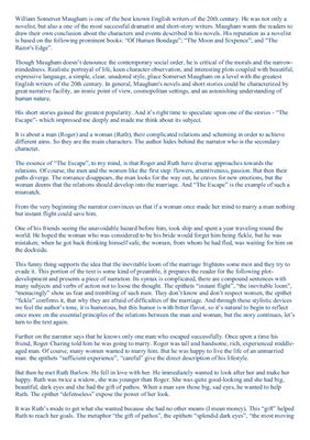 متن مورد تجزیه و تحلیل توسط ویلیام سامرست موام نوشته شده است. یکی از مشهورترین نویسندگان انگلیسی قرن بیستم است. او نه تنها یک رمان نویس بلکه یکی از موفق ترین نویسندگان داستان کوتاه است. شهرت او به‌عنوان یک رمان‌نویس بر اساس کتاب‌های برجسته‌ی زیر از اسارت انسان، ماه و شش پنس و لبه تیغ است. داستان های کوتاه او بیشترین محبوبیت را به دست آورد.