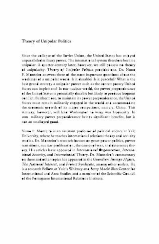 از زمان فروپاشی اتحاد جماهیر شوروی، ایالات متحده از قدرت نظامی بی نظیری برخوردار است. بنابراین نظام بینالملل تک قطبی است. با این حال، یک ربع قرن بعد، ما هنوز هیچ نظریه ای در مورد تک قطبی نداریم. نظریه سیاست تک قطبی یکی را ارائه می دهد. دکتر Nuno P. Monteiro به سه مورد از مهمترین سؤالات در مورد عملکرد یک جهان تک قطبی پاسخ می دهد. دوام داره؟ صلح آمیز است؟ بهترین استراتژی بزرگی که یک قدرت تک قطبی مانند ایالات متحده معاصر می تواند اجرا کند چیست؟ در دنیای هسته ای ما، برتری قدرت ایالات متحده به طور بالقوه بادوام است، اما احتمالاً منجر به درگیری مکرر می شود. علاوه بر این، برای حفظ برتری قدرت خود، ایالات متحده باید از نظر نظامی درگیر جهان باقی بماند و رشد اقتصادی رقبای اصلی خود، یعنی چین را تطبیق دهد. با این حال، این استراتژی واشنگتن را به جنگ مکرر سوق خواهد داد. در مجموع، برتری قدرت نظامی مزایای قابل توجهی به همراه دارد، اما یک کالای بیآبی نیست.