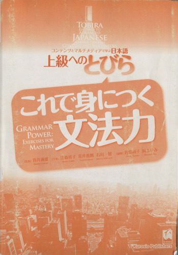 ■ Grammar Power: Exercises for Mastery تمرینهای مختلفی را برای کمک به زبانآموزان برای تسلط بر گرامر معرفیشده در Tobira: Gateway to Advanced Japanese ارائه میکند. Grammar Power روی مواردی در Tobira تمرکز دارد که برای زبانآموزان ژاپنی متوسط ضروری در نظر گرفته میشوند، یعنی موارد اجباری علامتگذاری شدهاند. با اعداد سفید در دایره های سیاه و موارد بسیار توصیه شده که با اعداد در دایره های خاکستری در یادداشت های دستور زبان Tobira مشخص شده اند. هر فصل شامل سه بخش است: Kiso (یادگیری مهارت های اساسی)، Ooyoo (به کارگیری مهارت های خود) و Hatten (گسترش مهارت های خود). با کار بر روی تمرینهای هر بخش به این ترتیب، زبانآموزان مهارتهای گرامر هدفمند را گام به گام کسب میکنند.