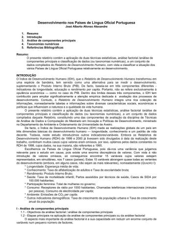 این گزارش شامل کاربرد دو تکنیک آماری، تحلیل عاملی/تحلیل مؤلفه های اصلی و طبقه بندی داده ها (یا عددی) است. طبقه بندی)، به مجموعه ای از داده های گردآوری شده از گزارش توسعه انسانی، با هدف طبقه بندی وضعیت توسعه کشورهای مختلف پرتغالی زبان.